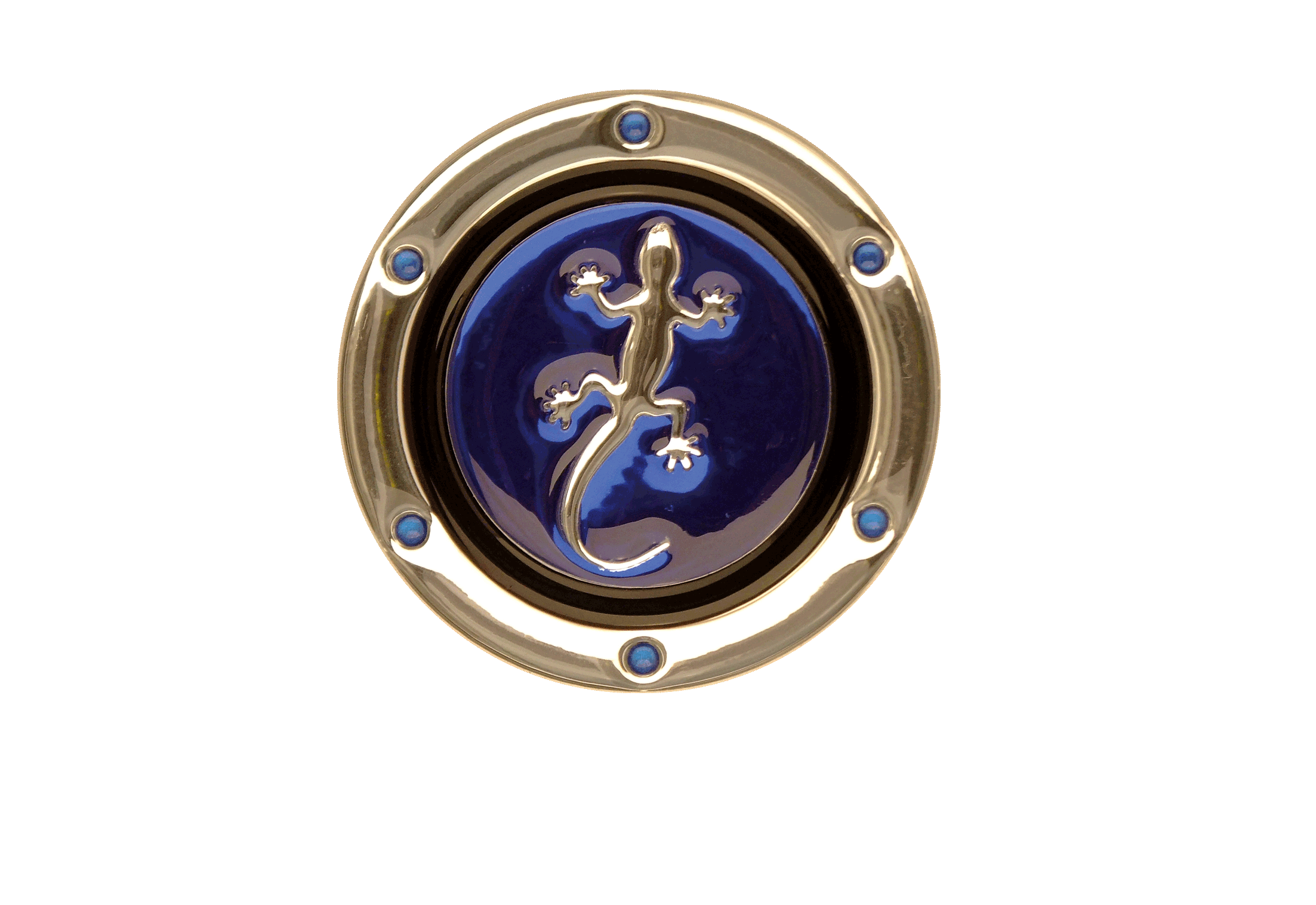 Verarbeitung mit Chrom Spiegelfolie, vier segmentierte Puzzle Teile, zwei Segmente davon einfarbig blau bedruckte. Der filigrane Gecko spiegelt sich 3D im dunklem Chromblau - ein Doming edel wie Schmuck.